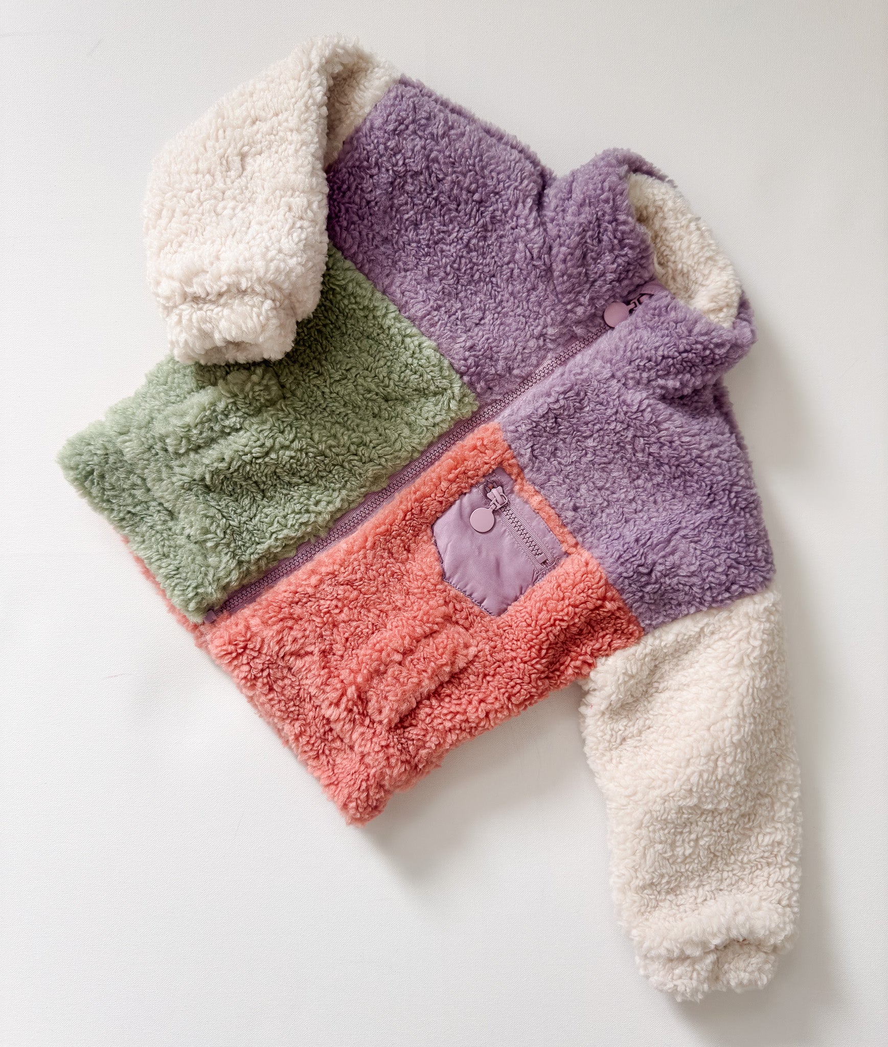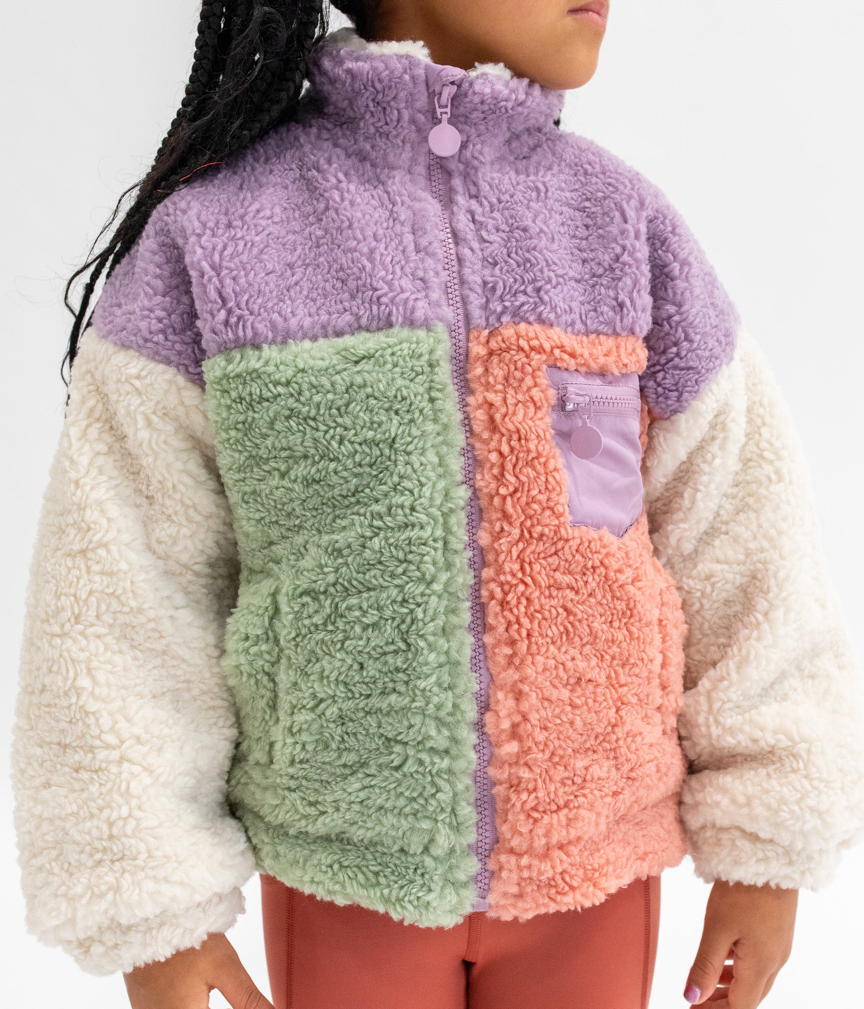 Add a playful pop of color to chilly days with our Color Block Jacket — Crafted from ultra-soft sherpa fabric, this cozy jacket features a vibrant mix of pastel color blocks, complemented by a sleek accent pocket and zipper. Designed with functionality and style in mind, it includes multiple front pockets, a smooth zipper closure, a mock neck collar for added warmth, and a silky matte polyester lining for comfort.